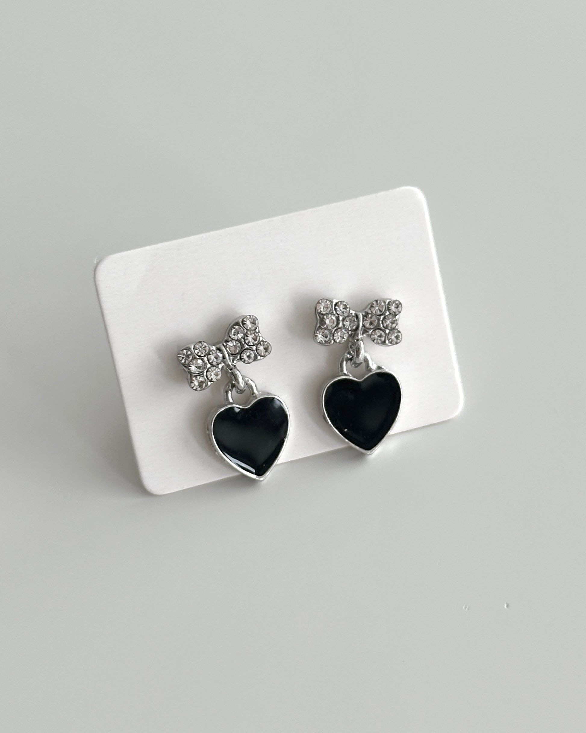 These black heart earrings dangle from silver bows for that perfect balance of sweetness and cool-girl charm