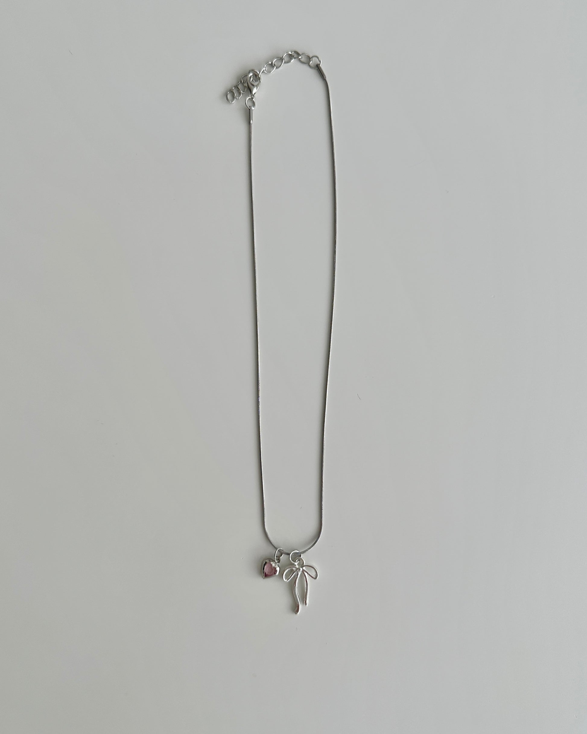 Sweet with a touch of sparkle — this necklace features a sleek silver chain with a dainty bow charm and a tiny pink heart accent. It’s the perfect piece to add a playful, girly vibe to your everyday look