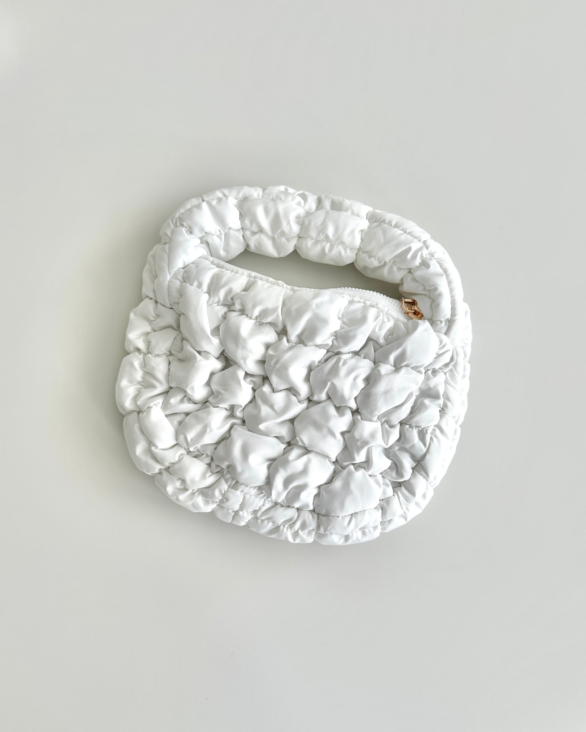 Light and soft, this ruched white shoulder bag brings major cloud-core vibes with its ultra-soft texture and puffy silhouette. Stylish yet functional, it's the perfect statement piece to brighten up any outfit — whether you’re headed to brunch or out for the day. Minimal, chic, and effortlessly cute.